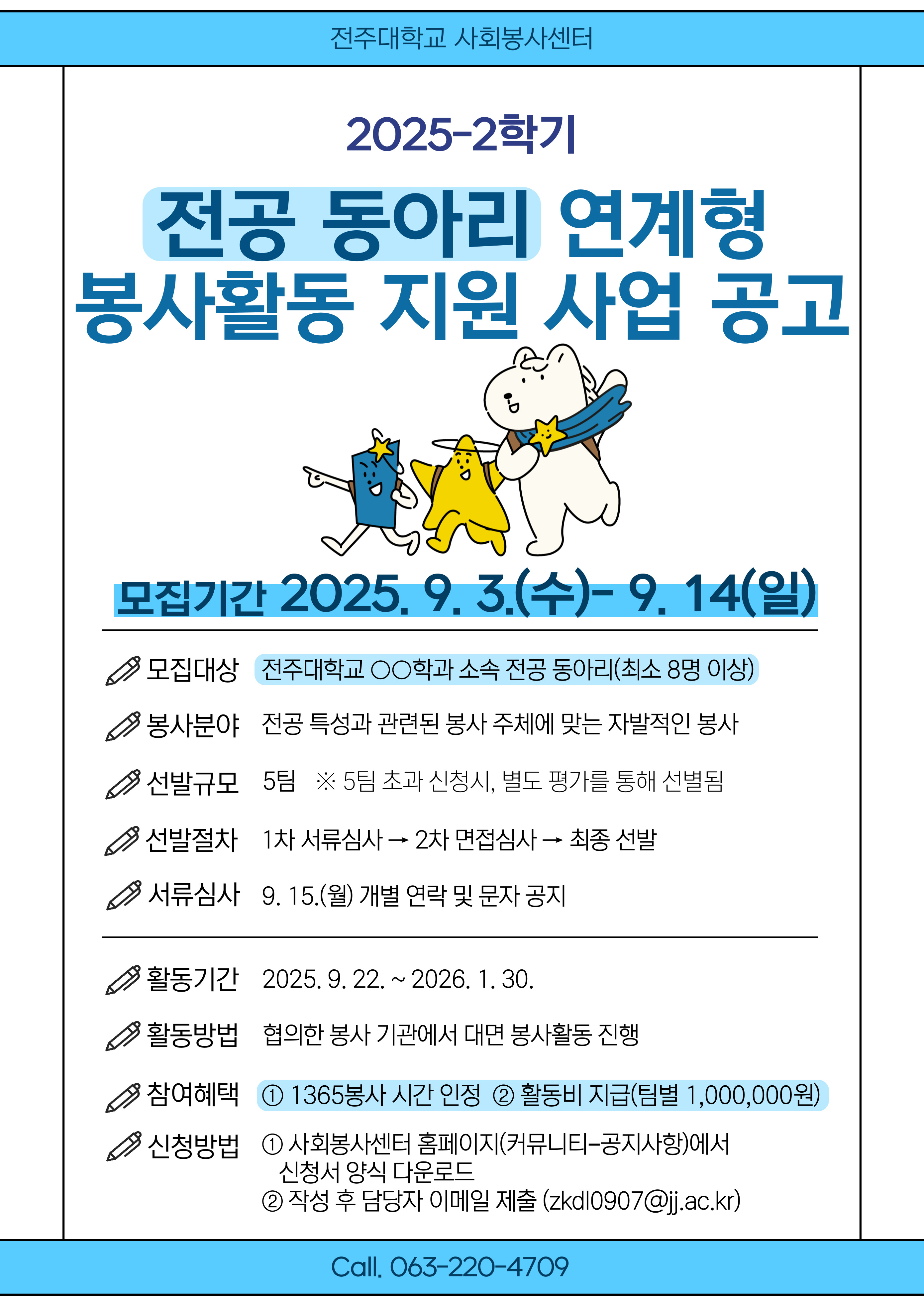 ▶ 신청 기간: 2025. 9. 3.(수)~9. 14.(일) 23:59까지 ▶ 신청 방법 - 전공 동아리 대표 1인이 신청서 작성하여 사회봉사센터 제출 (※신청: 홈페이지(커뮤니티-공지사항) 참고, 담당자 이메일로 제출 (zkdl0907@jj.ac.kr) ▶ 신청서 작성: (첨부파일 참조) - 봉사 기관: 팀 자체적 기관 연계, 신규 참여팀은 사회봉사센터 연계 협조 요청 가능 - 지도교수: 동아리 지도교수 사전 협의하여 필수 지정 (※단, 봉사기관은 1365 혹은 VMS에서 자원봉사활동 시간 입력이 가능한 인증된 기관이어야 함) ▶ 참가자 혜택 - 지원비 100만원 - 봉사시간 인정 ※ 주의 사항: 다른 기관에서 지원 사업비를 받는 경우, 참여 불가