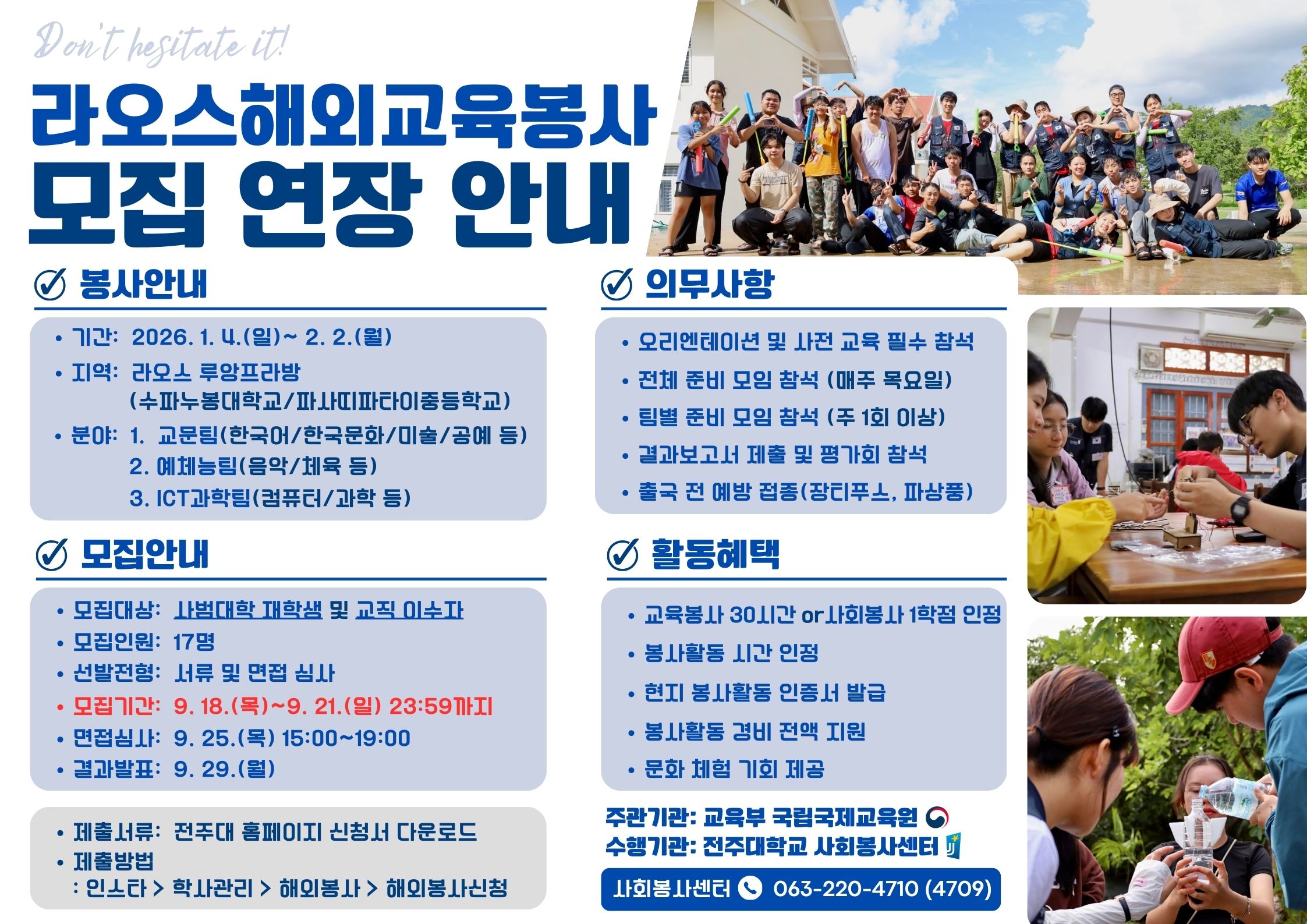 | [사회봉사센터] 2025 국립국제교육원 단기해외교육봉사 모집 연장 안내(사범대학 재학생 및 교직 이수자만 신청 가능)(~9.21까지) |
