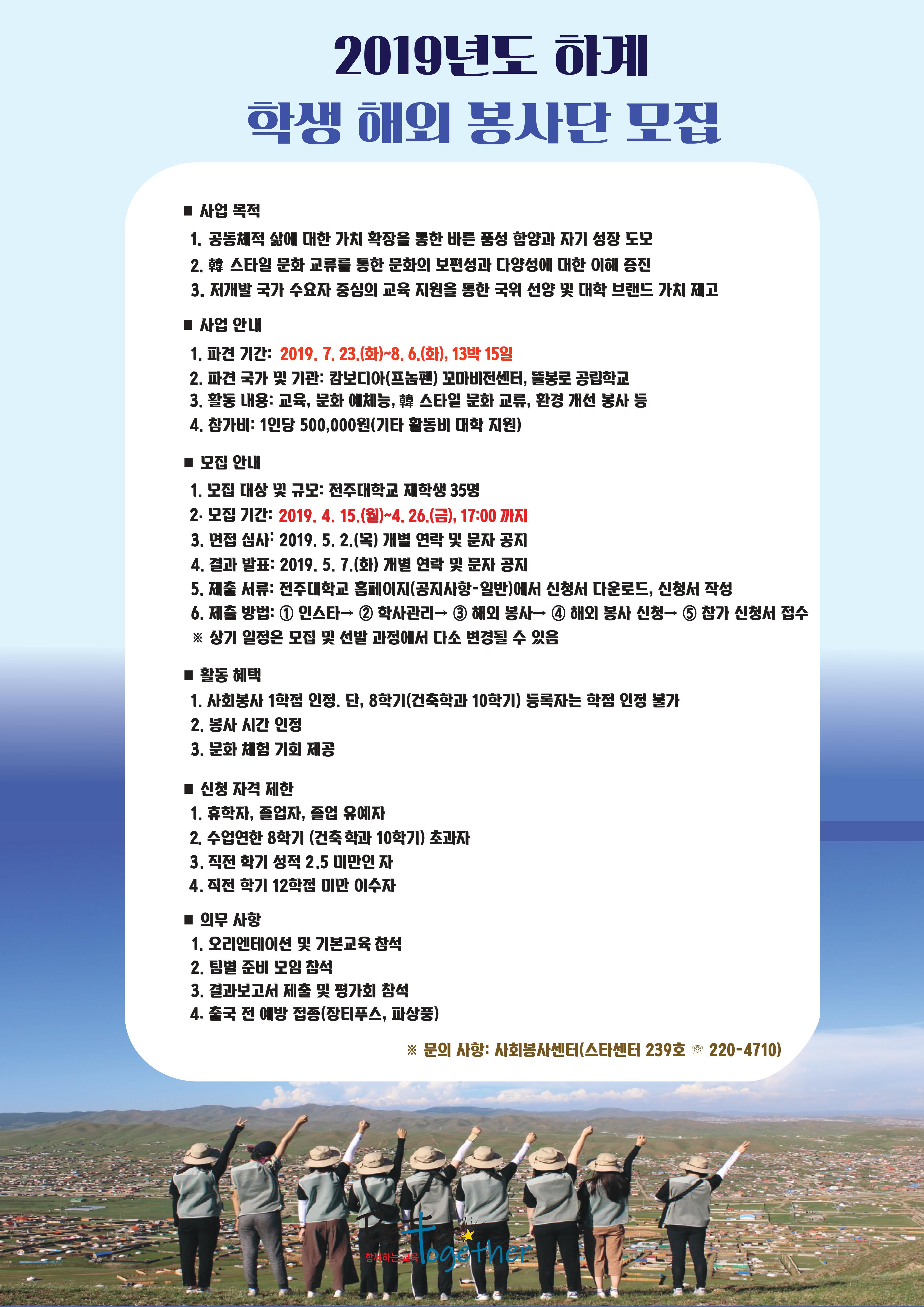 | 6 | 2019학년도 하계 해외 봉사활동 모집 안내 | 사회봉사센터 | 19-04-30 | 600 |