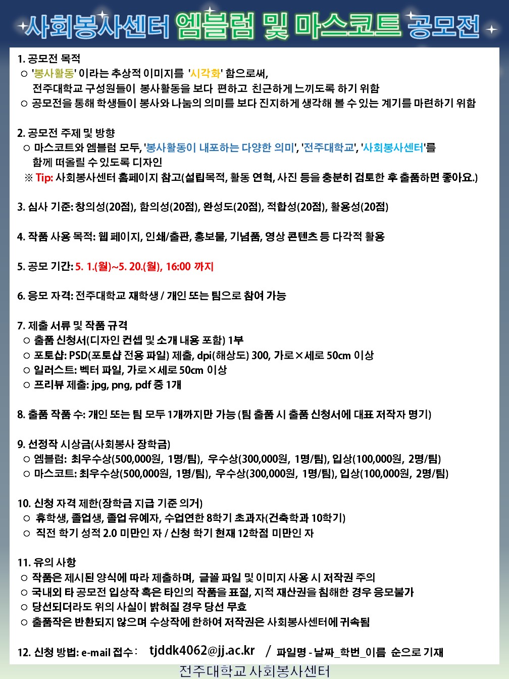 | 7 | 개교 55주년 기념 사회봉사센터 엠블럼 및 마스코트 공모전 | 사회봉사센터 | 19-05-01 | 958 |