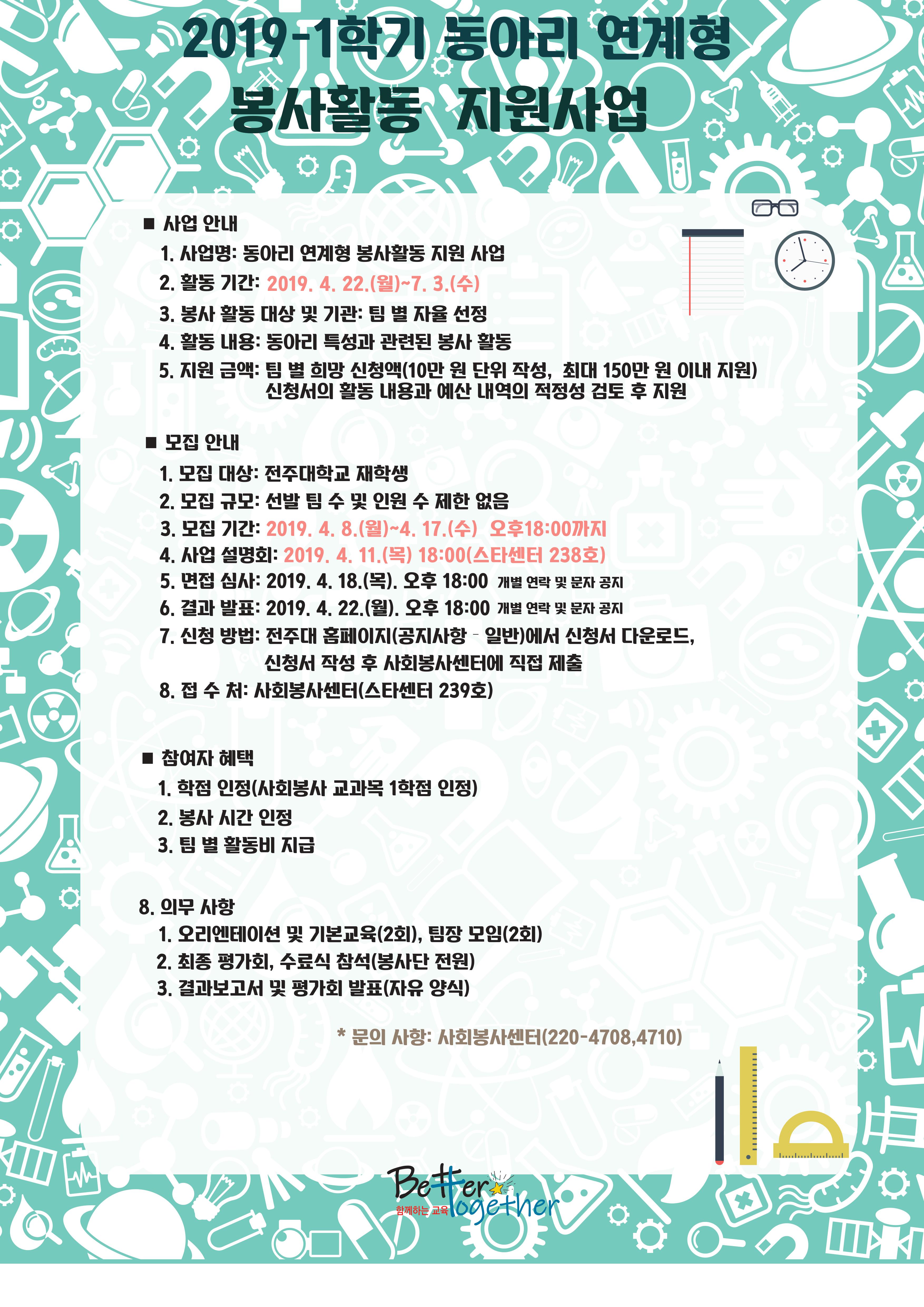 | 4 | 2019학년도 1학기 동아리 연계형 봉사활동 지원 사업 모집 안내 | 사회봉사센터 | 19-04-30 | 360 |