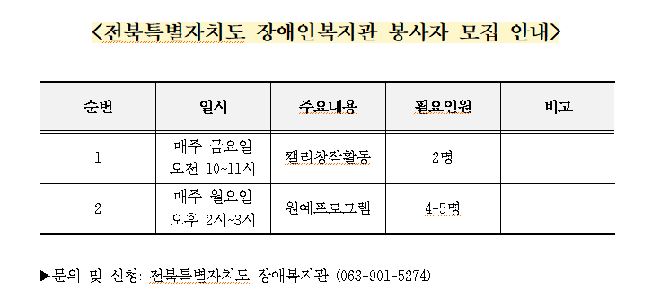| 26 | 전라북도장애인복지관 봉사자 모집 안내 | 사회봉사센터 | 24-03-18 | 230 |