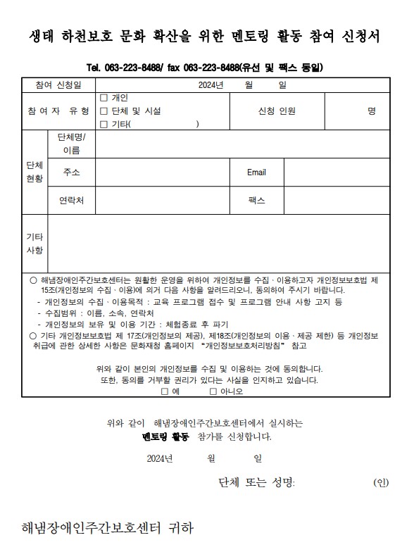 생태 하천 보호 문화 확산을 위한 성인 장애인 멘토링 봉사자 모집 안내
