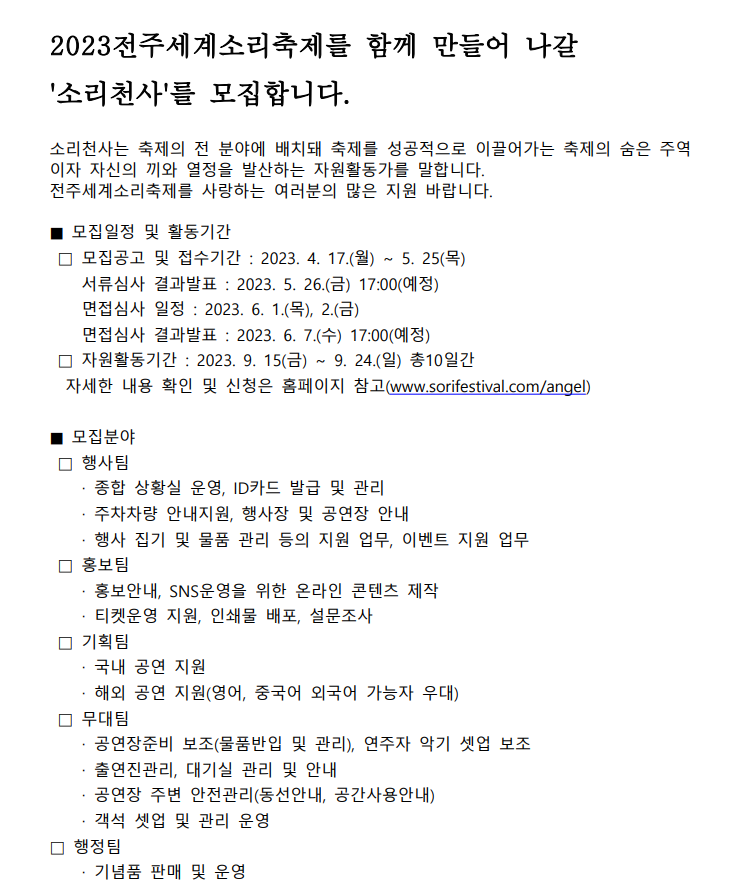2023 전주세계소리축제 자원활동가 '소리천사' 모집 안내