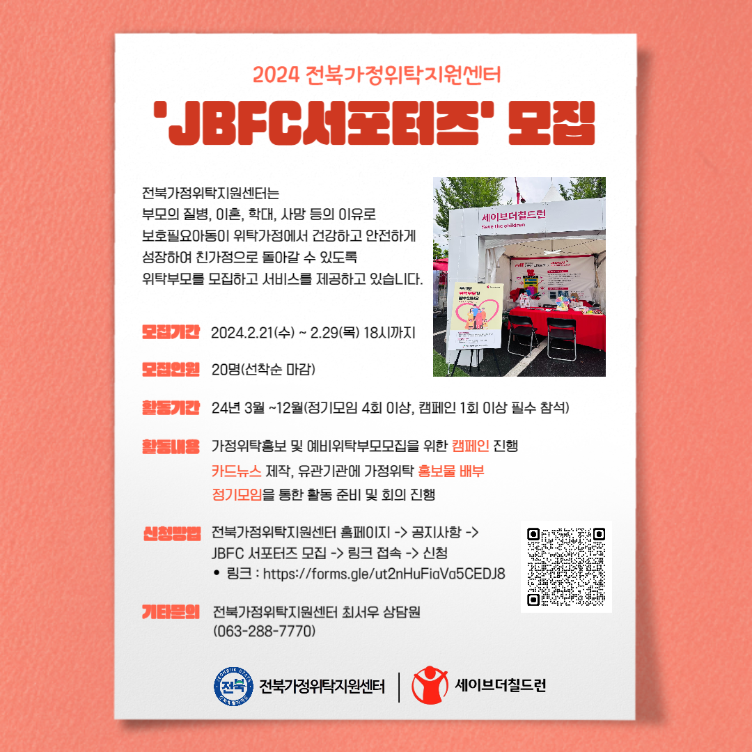 2024 전북가정위탁지원센터 'JBFC 서포터즈' 자원봉사자 모집 안내